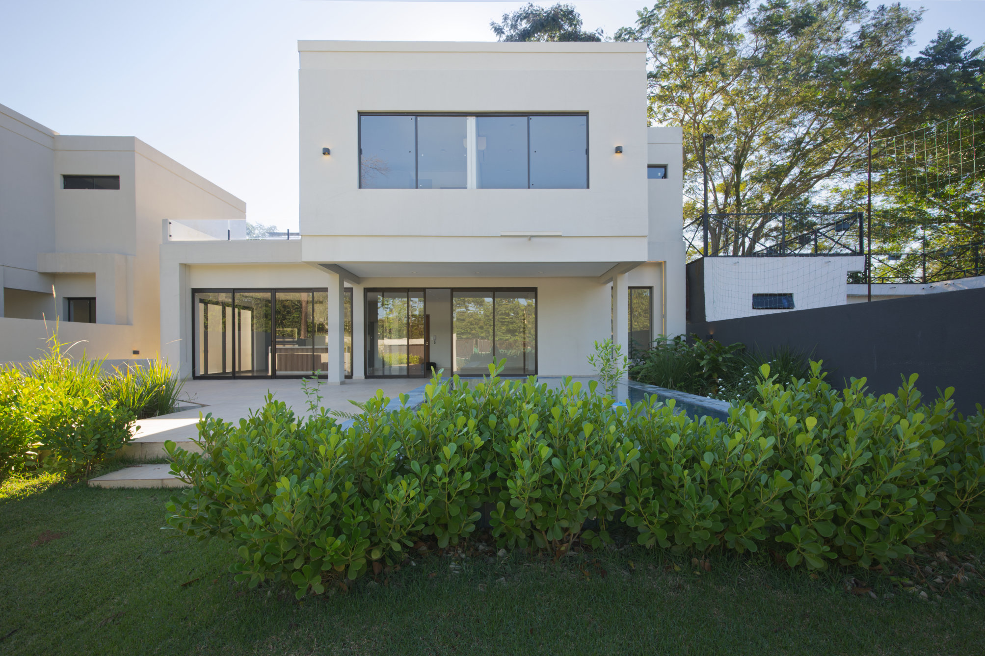- Geräumige Erdgeschoss-Außenterrasse mit Blick auf den beleuchteten Garten und Pool